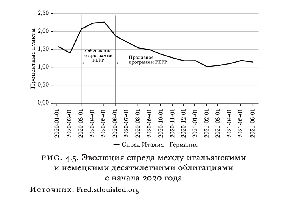 Рассмотрим действия ЕЦБ во время кризиса, вызванного COVID-19. На рис. 4.5 показана, например, динамика спреда доходности 10-летних итальянских облигаций относительно немецких с начала 2020 года. По мере развития кризиса вновь возникли старые опасения по поводу итальянского долга, и с февраля по июнь спред между итальянскими и немецкими облигациями вырос примерно на 80 базисных пунктов. В марте 2020 года ЕЦБ объявил о запуске программы покупки облигаций (Pandemic Emergency Purchase Program, PEPP) объемом до 750 млрд евро, расширенной до 1,3 трлн евро в июне, и начал скупать итальянские (и другие) государственные облигации, чтобы стабилизировать и снизить доходности. К началу мая, несмотря на сохраняющуюся остроту кризиса, спреды действительно сократились, вернувшись к докризисным уровням к концу лета 2020 года.