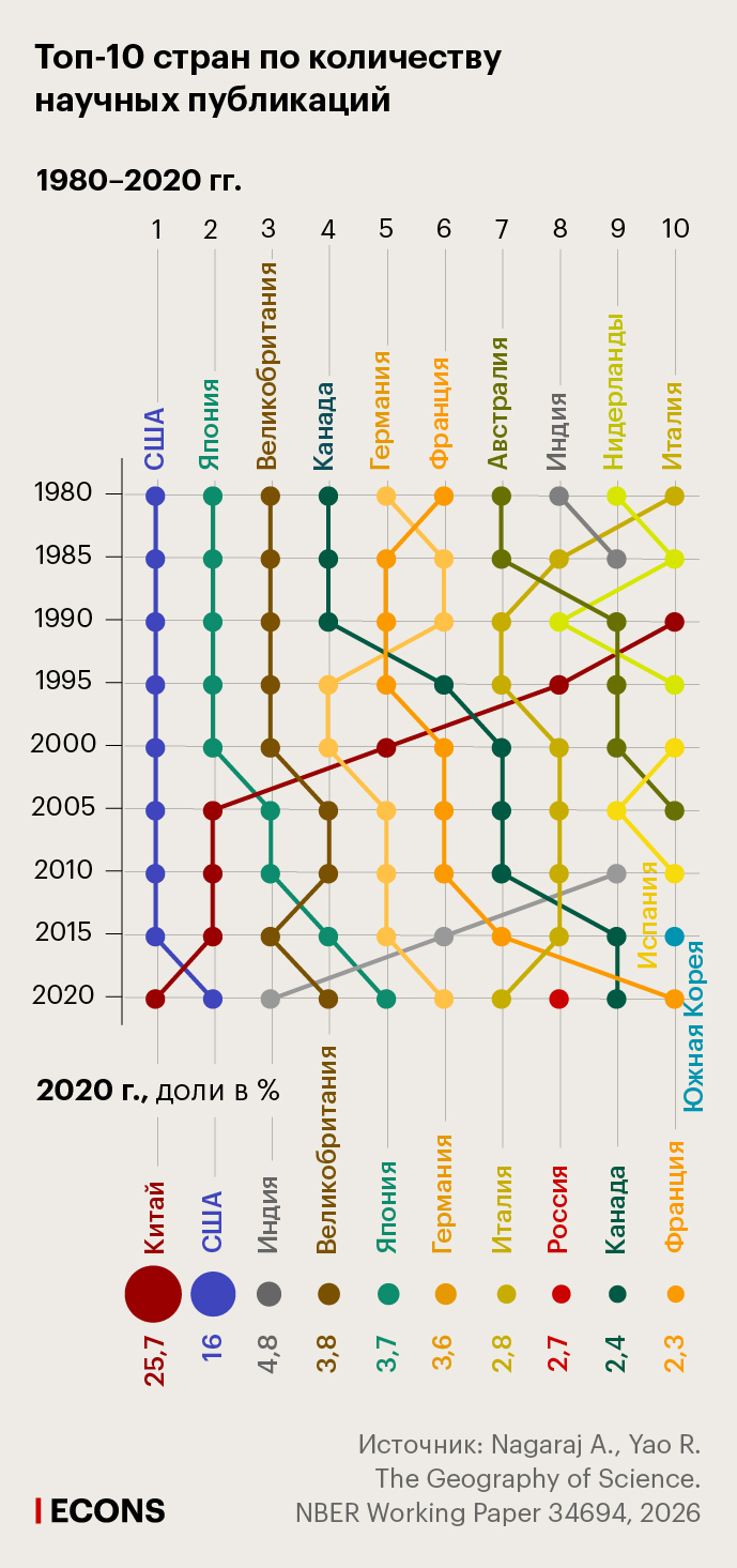 США за это время уступили лидерство Китаю по доле публикаций, в том числе в ведущих мировых научных журналах. Однако это не привело к соразмерному сдвигу в глобальном распространении и интеграции научных знаний, обнаружили авторы.