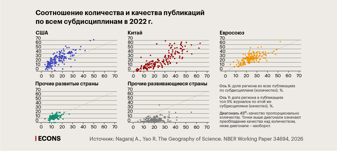 В целом показатели «количества и качества» научных исследований демонстрируют существенную асимметрию в глобальной науке: очень высокое (в соотношении с количеством) качество работ США, сохраняющих статус передового глобального научного центра; баланс качества и количества работ в развитых странах; «избирательное качество» китайских исследований; и значительный разрыв между количеством и качеством исследований в остальном мире.