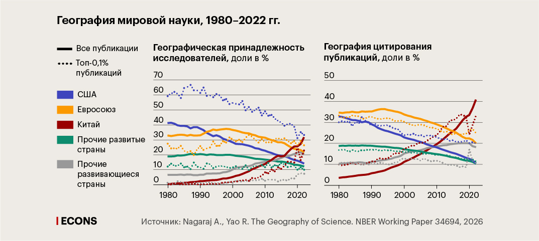 - Но за это время произошел колоссальный сдвиг в географии производства науки (см. инфографику выше). С 1980 по 2022 г. доля США в мировых научных публикациях упала с 40% до 15%, Китая – взлетела с почти нуля до 32%, превзойдя доли США и ЕС. На Китай в том числе приходится порядка 35% высококачественных публикаций (топ-5% журналов) и 23% прорывных работ (топ-0,1% публикаций). Этот рост обусловлен не только увеличением числа исследователей, но и повышением их индивидуальной производительности и не связан с сотрудничеством китайских ученых с западными (см. ниже, как получен такой вывод).