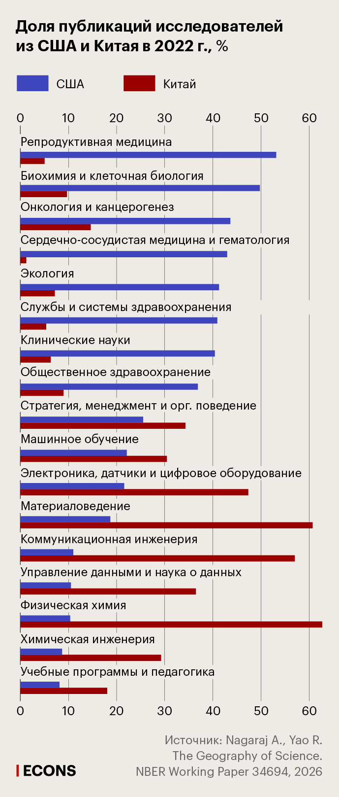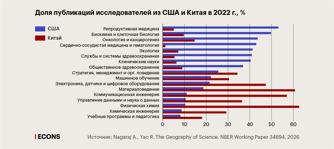 Это расхождение отражает принципиально разные стратегии развития: в то время как США сосредоточили свои научные достижения в областях, связанных со здравоохранением и науками о жизни, Китай фокусируется на дисциплинах, связанных с его целями промышленного и технологического развития.