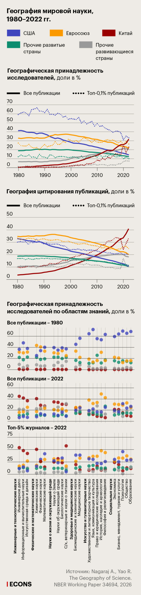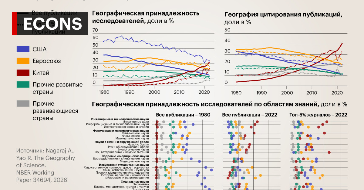 Что еще показала «географическая карта» науки 1980–2022 гг.: «Эконс» суммировал основные выводы исследования – о том, кто производит знания и в каких областях науки и кто их потребляет.