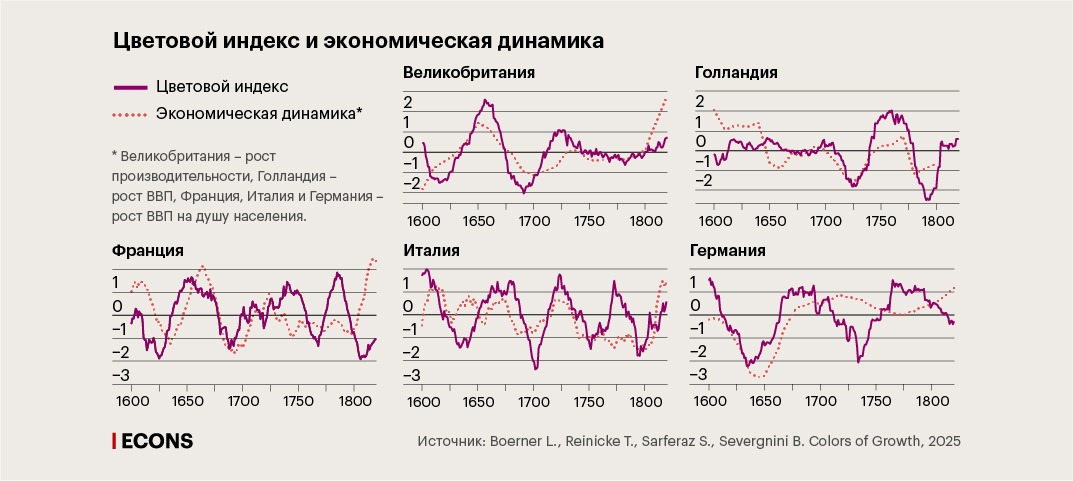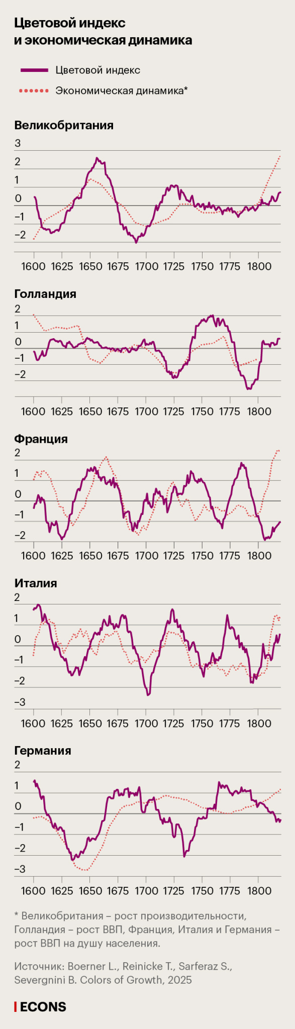 Цветовая палитра, которую использовали живописцы прошлых столетий, может служить индикатором экономического развития государств. Подобно тому как современные экономисты используют снимки ночной освещенности из космоса в качестве надежного индикатора активности, хорошо коррелирующего с ВВП и позволяющего восполнить пробелы данных, анализ «освещенности» исторических полотен позволяет отследить экономическую динамику прошлых веков, о которой нет статистических сведений, а реконструкции ВВП дают лишь примерную картину.