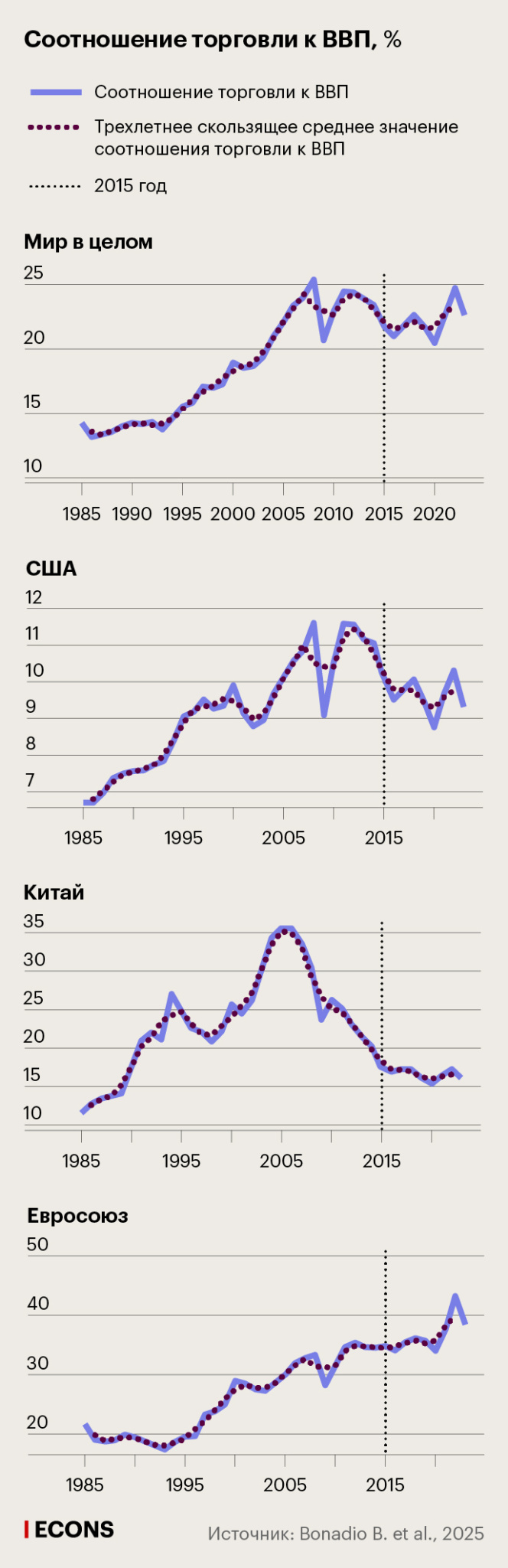 2015-й год был взят в качестве отправной точки как последний «спокойный год» перед началом череды событий, приведших к фрагментации (в 2016 г. Великобритания проголосовала за Брекзит, а в США был избран президентом Дональд Трамп, в 2018 г. началась торговая война США с Китаем). Кроме того, 2015-й год позволяет отсечь влияние двух предыдущих масштабных кризисов – глобального финансового кризиса 2008–2009 гг. и европейского долгового кризиса 2010–2012 гг., – которые также сказались на глобальной торговле. К 2015 г. она более-менее стабилизировалась после этих потрясений, что дает возможность на периоде последующих лет оценивать влияние именно фрагментации, а не последствий финансовых кризисов.