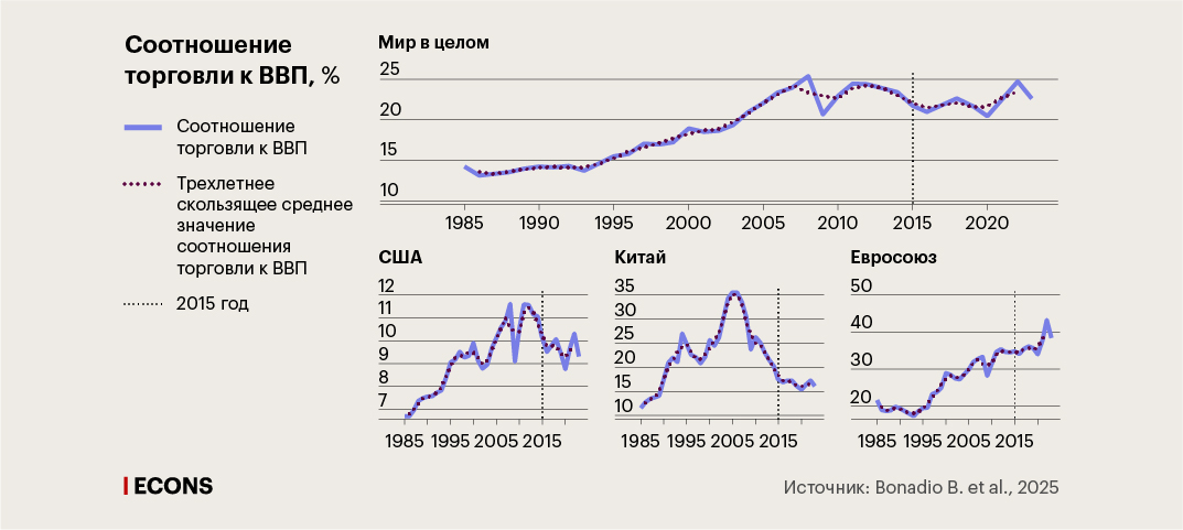 Фрагментация пока не привела к деглобализации, заключают исследователи: в целом объемы мировой торговли за исследуемый период стабильны и даже растут, то же самое можно сказать о торговле крупнейших экономик – США, Китая, ЕС. Правда, указывают авторы, вывод исследования касается только «первого раунда» перегруппировки мировой торговли, который не охватывает события последних двух лет, 2024–2025 гг., включая тарифную эскалацию.