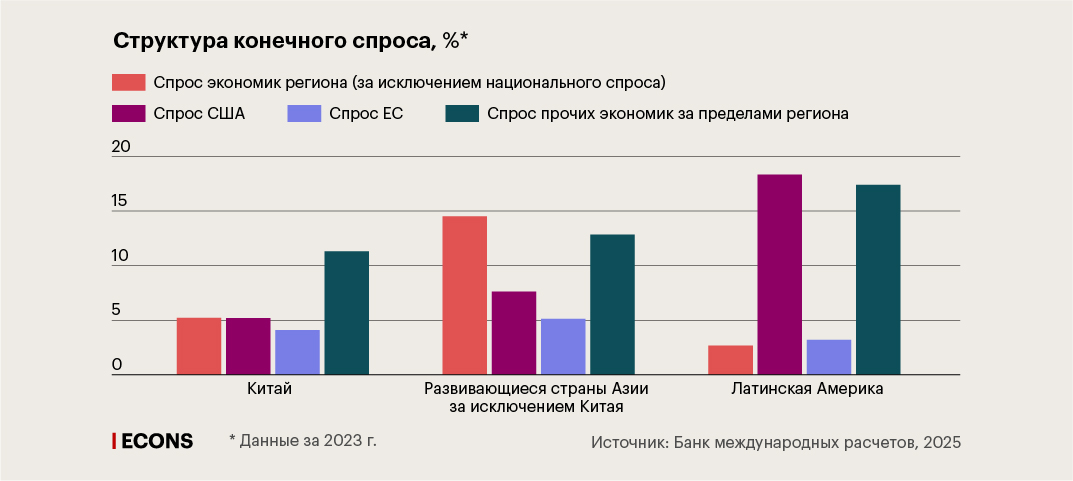 Так, в Латинской Америке почти 40% добавленной стоимости в производстве товаров связано с конечным спросом, порождаемым экономиками за пределами региона, – против всего 2,7%, которые приходятся на внутрирегиональные экономики. В развивающейся Азии доля спроса от экономик за пределами региона чуть более 20%, а доля спроса внутри региона невелика – например, для Китая это 5,2%, а для других стран развивающейся Азии за исключением Китая – порядка 14,5%.