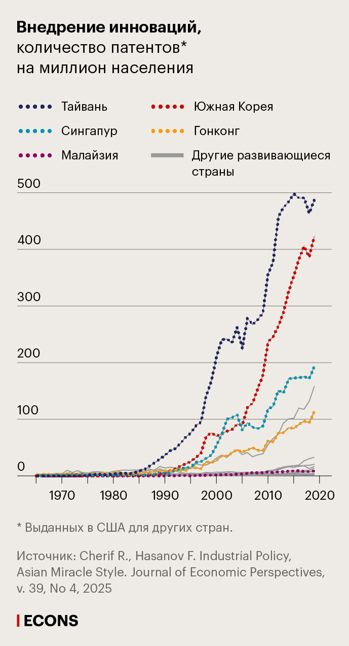 Показателен пример и в сфере электроники, где Южная Корея и Тайвань стартовали одновременно с Малайзией. Первые не полагались на прямые иностранные инвестиции: они, как правило, налаживали партнерские отношения с транснациональными корпорациями, лицензировали критически важные зарубежные технологии, но быстро создавали собственные. Малайзия же сделала главную ставку на филиалы международных компаний. Но те не стремились создавать в стране инновации. В итоге: Южная Корея получила Samsung, Тайвань – Taiwan Semiconductor Manufacturing Company (TSMC), а Малайзия – ни одного сопоставимого технологического лидера.