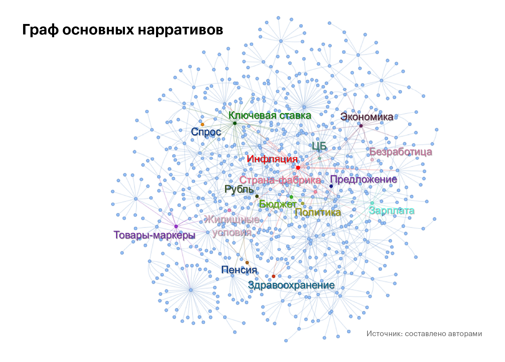 Наше исследование построено как качественная работа в логике grounded theory: глубинные интервью, последующее многоэтапное кодирование и сбор «карты нарративов» с использованием графовых методов работы с текстом. Итогом стала связная карта представлений об инфляции, экономике и ключевой ставке, объединяющая более 165000 тегов в 16 «ядерных» категорий (см. график). Эмпирическая база – 52 глубинных интервью в 11 крупных городах, охватывающих все федеральные округа (интервью «лицом к лицу», июнь 2024 г.). Важное ограничение: это не репрезентативный опрос и не измерение частот, а описание спектра и внутренней логики нарративов.