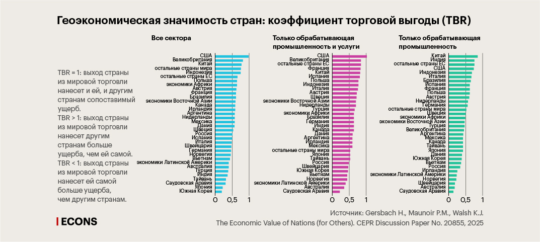 Мы разработали коэффициент торговой выгоды (trade benefit ratio, TBR) – показатель для оценки геоэкономической значимости стран через их торговые связи. Эта метрика дает простую и обобщенную меру того, насколько значимую ценность страна предоставляет другим через международную торговлю по сравнению с той выгодой, которую получает от этой торговли сама.