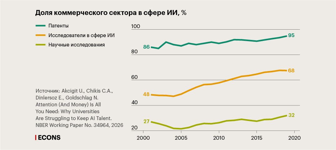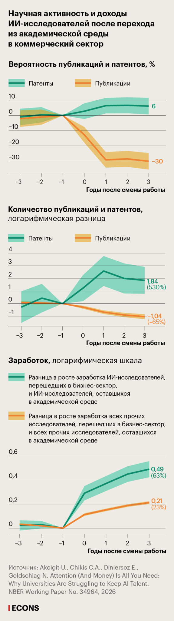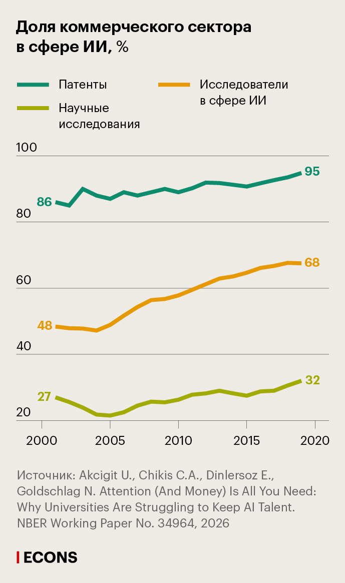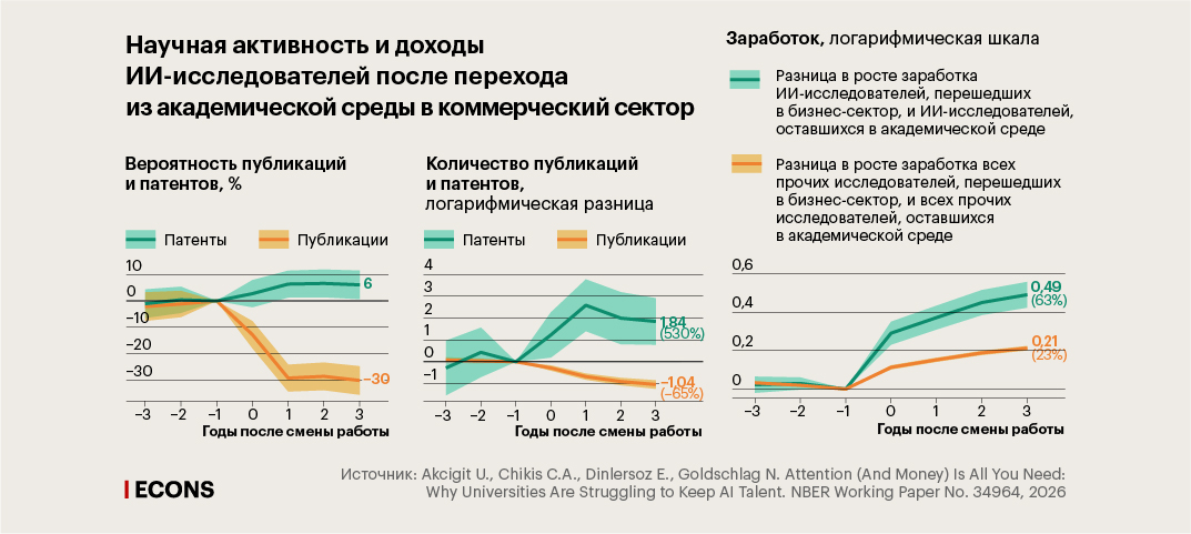 В совокупности эти данные говорят о том, что переход талантов в области ИИ из академической сферы в бизнес меняет частную отдачу от исследований и форму самих исследований, смещая акцент с публикаций на коммерциализацию знаний.