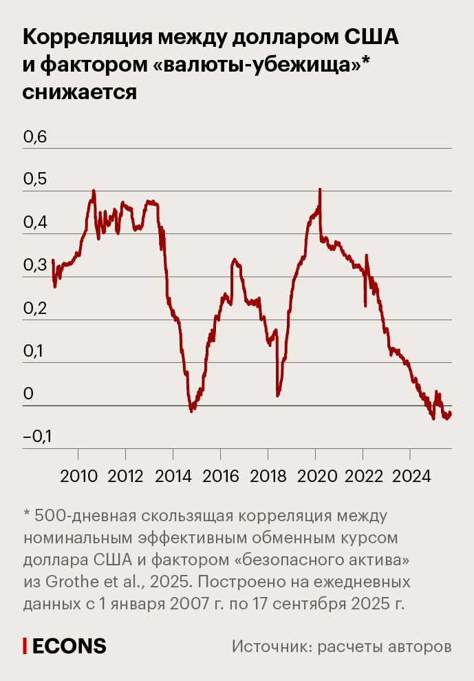 Статус валюты как «тихой гавани» может быть обусловлен целым рядом фундаментальных характеристик. Например, типичное поведение иены и швейцарского франка как валют-убежищ часто объясняют тем, что они используются (1, 2) для финансирования операций керри-трейд (стратегия получения прибыли на разнице процентных ставок двух стран: заимствования в валюте с низкой ставкой для инвестиций в валюту с высокой ставкой. – Прим. «Эконс»). В периоды роста неопределенности инвесторы спешно закрывают такие сделки, скупая иену и франк для возврата займов, что ведет к укреплению этих валют.