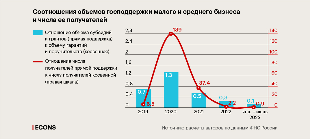 Собственно, в ряде регионов увеличение помощи не привело к росту числа субъектов МСП. Это может объясняться как особенностями отдельных территорий и их предпринимательских экосистем, так и невозможностью полностью исключить двунаправленную причинно-следственную связь: государство в кризис обоснованно направляло больше средств именно туда, где было хуже всего.