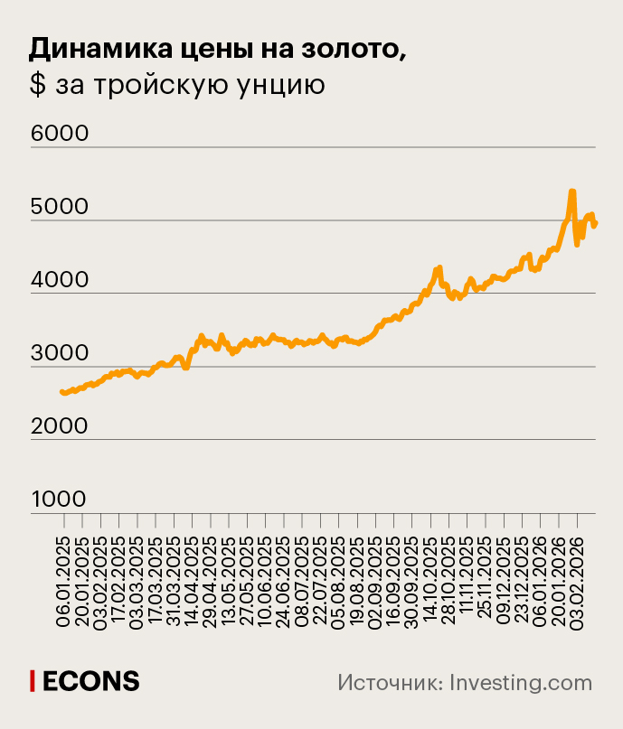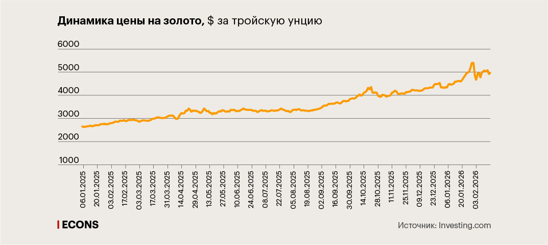 В 2025 г. стоимость тройской унции золота 53 раза обновляла рекорды, за год увеличившись на 65% до $4308. А уже к концу января 2026 г. на торгах в течение дня превысила $5500, прежде чем всего за пару дней резко откатиться назад.