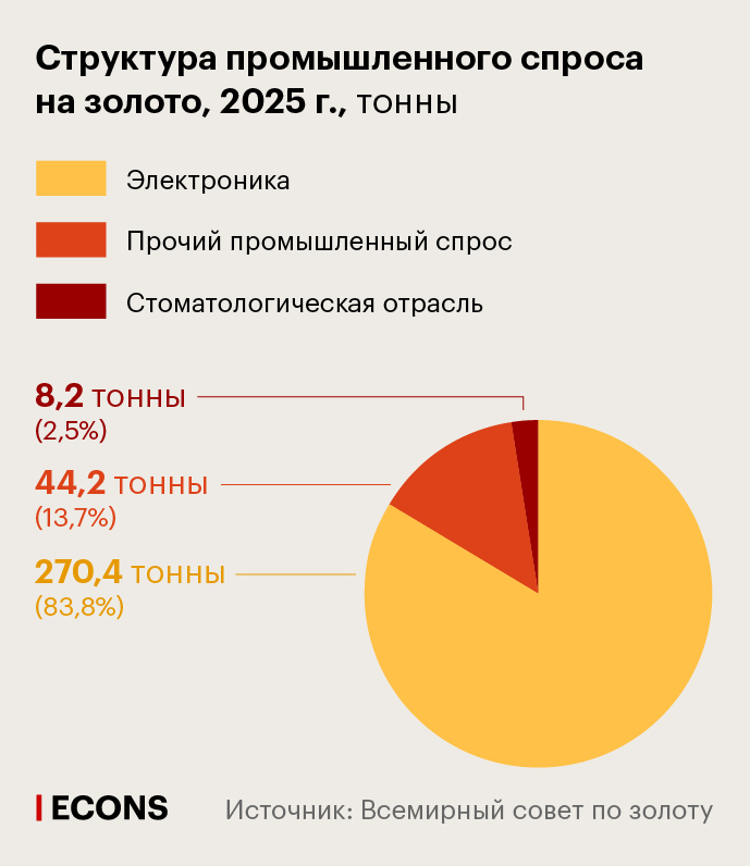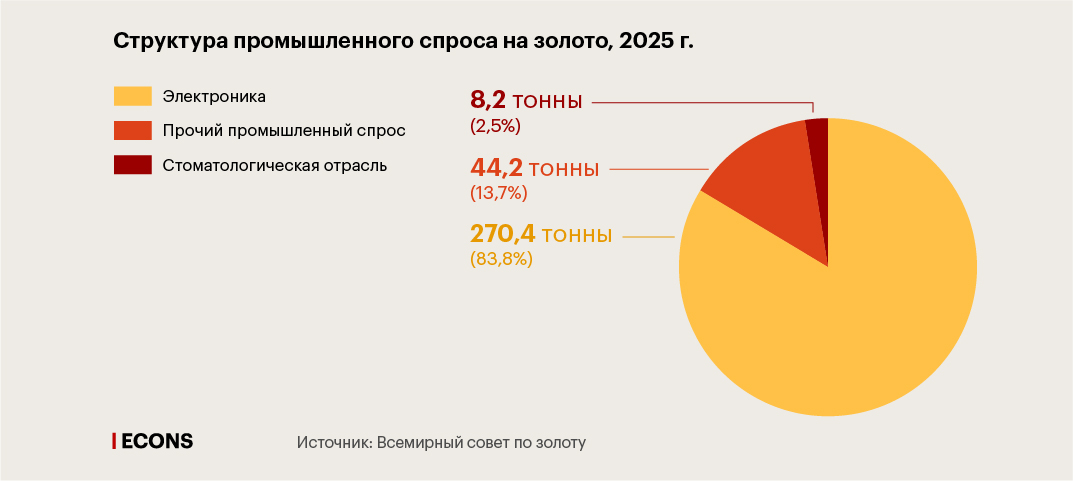 Технологический сектор остается одним из наиболее устойчивых каналов спроса – по итогам 2025 г. промышленные компании приобрели около 323 тонн золота (снижение на 1% за год). Ключевым фактором для сектора в течение года оставался бум в сфере искусственного интеллекта, который поддерживал спрос на электронику: необходимость обеспечения высокоскоростных вычислений привела к увеличению использования золотых соединительных проводов, контактных материалов и межсоединений.