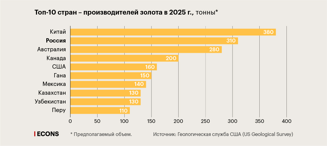 Россия устойчиво входит в топ-3 лидеров. Официальная статистика с 2022 г. не раскрывает абсолютный объем производства золота, но, например, по оценкам компании «Технологии Доверия», в 2025 г. этот показатель мог составить 345 тонн.