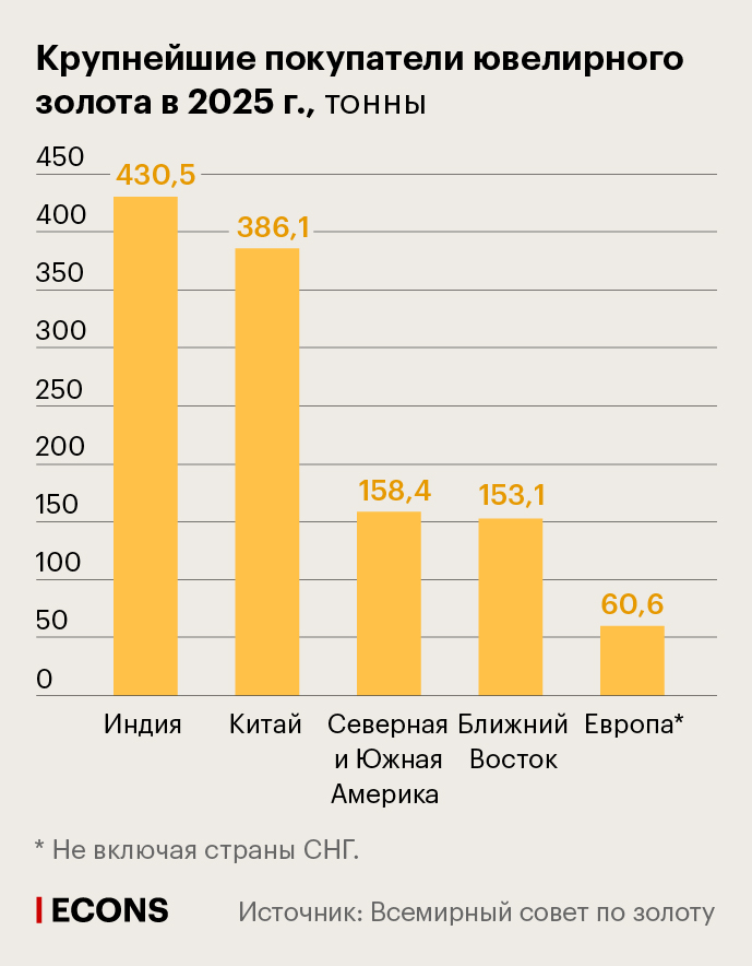 Потребители в традиционно активных с точки зрения покупки ювелирных украшений регионов – Азия и Ближний Восток – не способны наращивать траты с такой же скоростью, как растут цены. По итогам 2025 г. ювелирный спрос на золото и в Индии, и в Китае снизился на 24% по сравнению с 2024 г., на Ближнем Востоке – на 11%, при этом отдельные страны показали более серьезную «просадку» – Турция минус 20%, Египет минус 18%, ОАЭ и Кувейт по минус 15%.