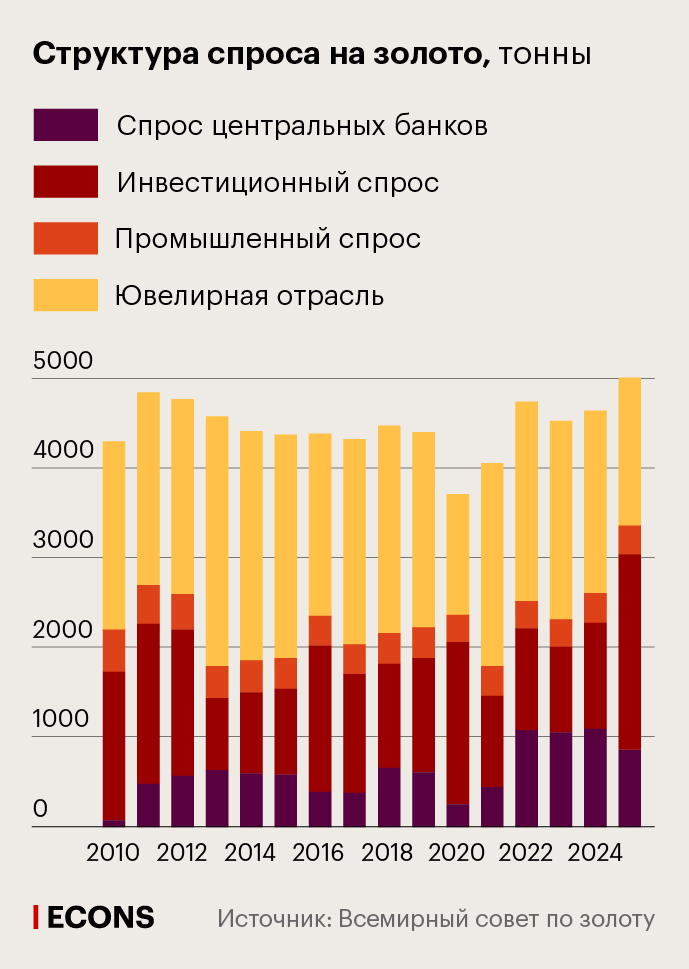 На протяжении долгого времени спрос ювелирной отрасли составлял львиную долю совокупного спроса: в среднем около 50% в 2010–2022 гг., в отдельные годы превышая 60%. Однако на фоне резкого роста цены эта доля снизилась и на конец 2025 г. составила всего 33%.