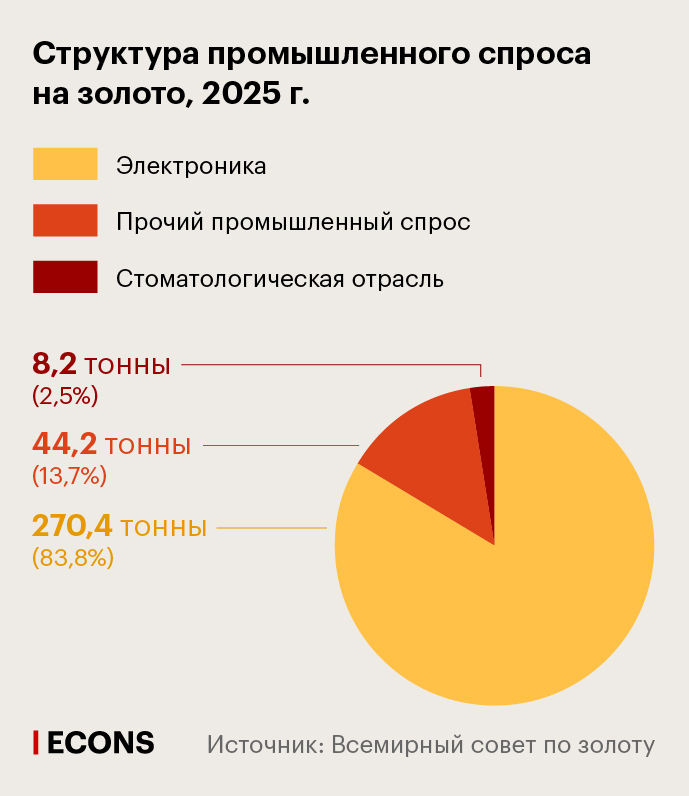Технологический сектор остается одним из наиболее устойчивых каналов спроса – по итогам 2025 г. промышленные компании приобрели около 323 тонн золота (снижение на 1% за год). Ключевым фактором для сектора в течение года оставался бум в сфере искусственного интеллекта, который поддерживал спрос на электронику: необходимость обеспечения высокоскоростных вычислений привела к увеличению использования золотых соединительных проводов, контактных материалов и межсоединений.