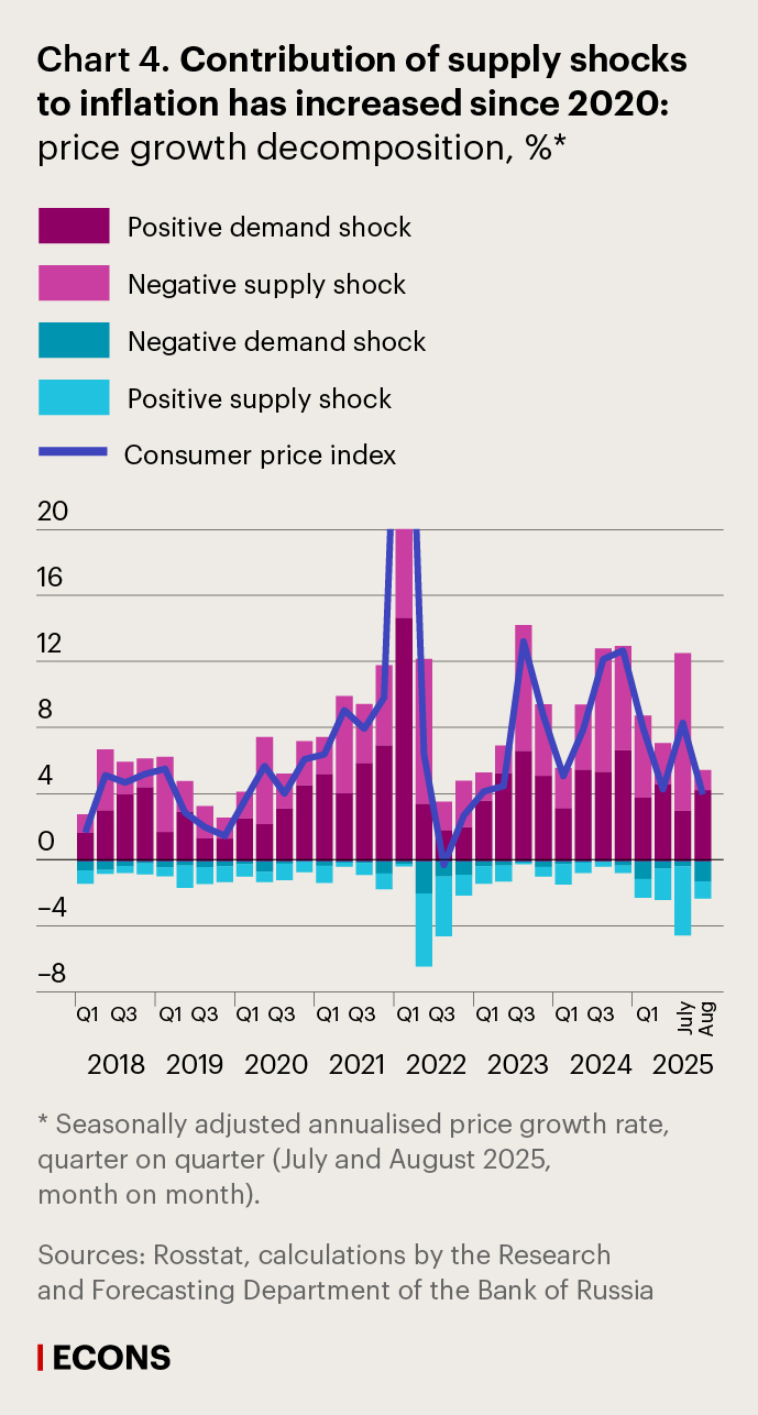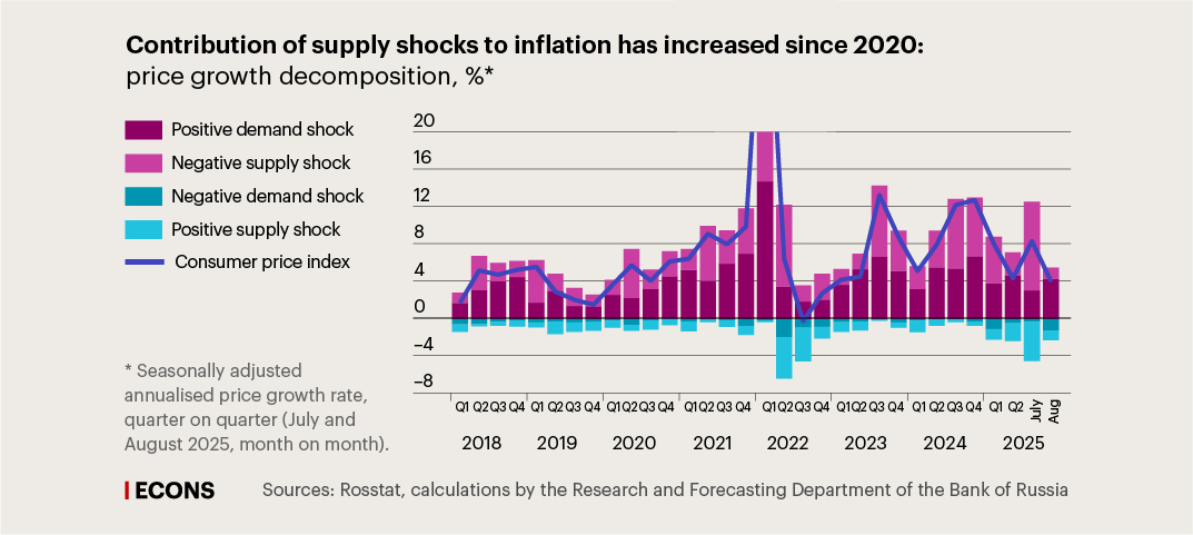 Examples include increasingly complicated and expensive supply chains, escalating tariff wars, as well as a sustained and significant rise in commodity prices. Such a commodity supercycle was observed in the early 2000s, and Russia, as a commodity exporter, was a beneficiary of this supercycle. In Russia, proinflationary supply shocks prevail, and their contribution to price growth has substantially increased after 2020.