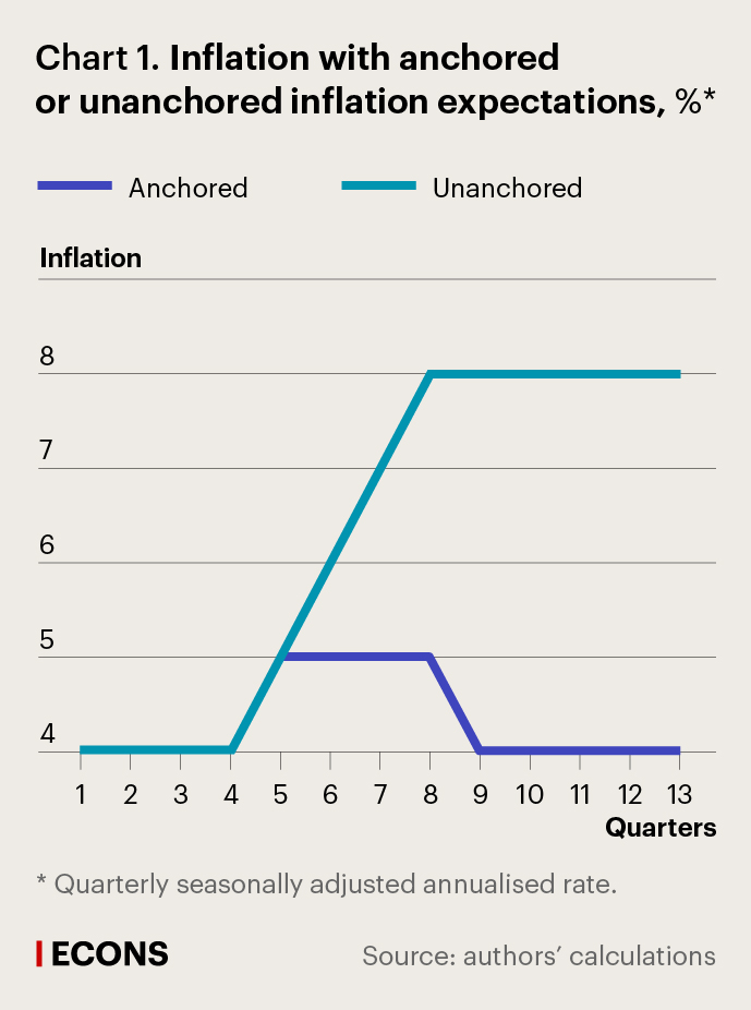 This scenario requires a full-scale monetary policy response as rising inflation expectations lead to automatic easing of monetary conditions – even if interest rates do not decline, because households and businesses start to perceive the current level of interest rates in real terms (that is, net of future inflation) as lower than before. This encourages them to take out more loans and save less, which results in higher demand and debt burden but lower savings for the future, thus further contributing to persistent inflation, which again raises inflation expectations and creates a self-reinforcing spiral. Such a scenario might unfold if the central bank underestimates this mechanism of unanchored inflation expectations in its monetary policy decisions.