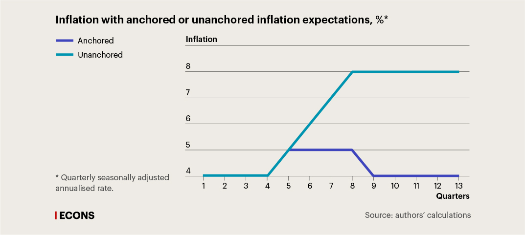 Anchored inflation expectations allow monetary authorities to respond more flexibly, including to pursue countercyclical policy, i.e. to be guided primarily by the stage of the business cycle rather than by price dynamics. This is important because price spikes triggered by one-off factors can occur during a recession, which typically requires accommodative monetary policy.