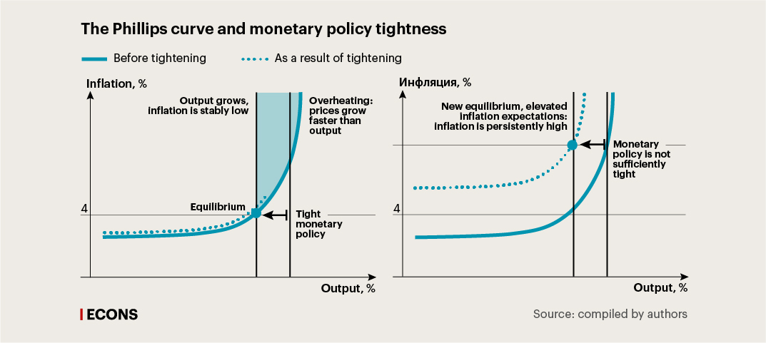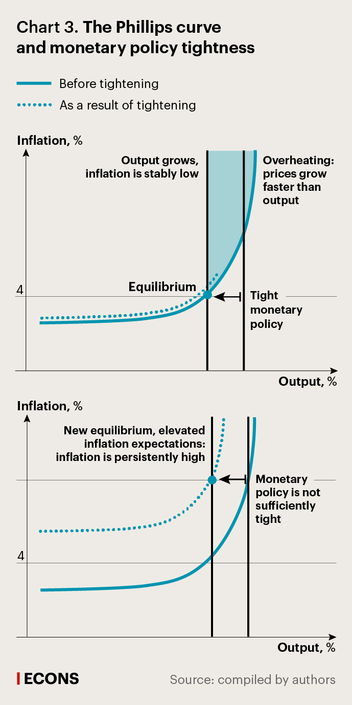 The impact of monetary policy on economic activity and inflation depends on the shape of the Phillips curve and the specific point on the curve where the economy is currently situated (see the diagram in Chart 3). The Phillips curve illustrates the relationship between the deviation from the equilibrium level of economic activity (unemployment) and the deviation of inflation from the target. Among economists, there is a growing consensus that the Phillips curve in the modern economy is non-linear and resembles a hyperbola in shape (rather than having become flat, as it seemed in the 2010s (link in Russian) during the period of ultra-low interest rates).
