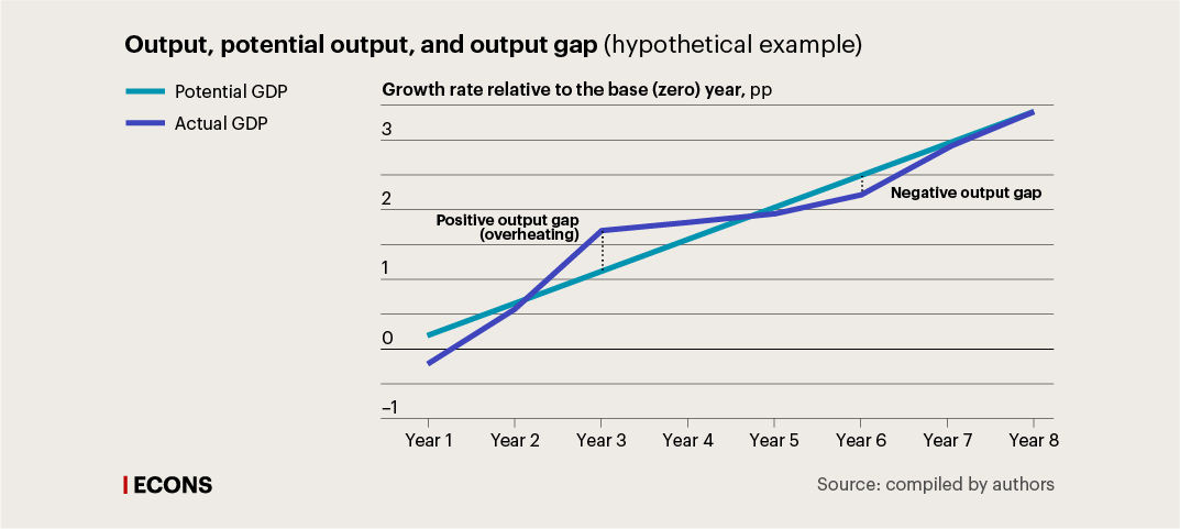 A surge in output beyond its potential under the influence of demand-side stimuli is overheating. It accelerates inflation, and therefore, such growth cannot be considered sustainable as it leads to the accumulation of imbalances. If overheated demand (i.e. actual GDP) slows down and, for a certain period, increases at a pace lower than that of potential GDP, then, at some point, the potential will catch up to or even surpass demand (years 5–6 in Chart 2). This will ensure additional disinflationary effect that is needed to anchor inflation expectations.